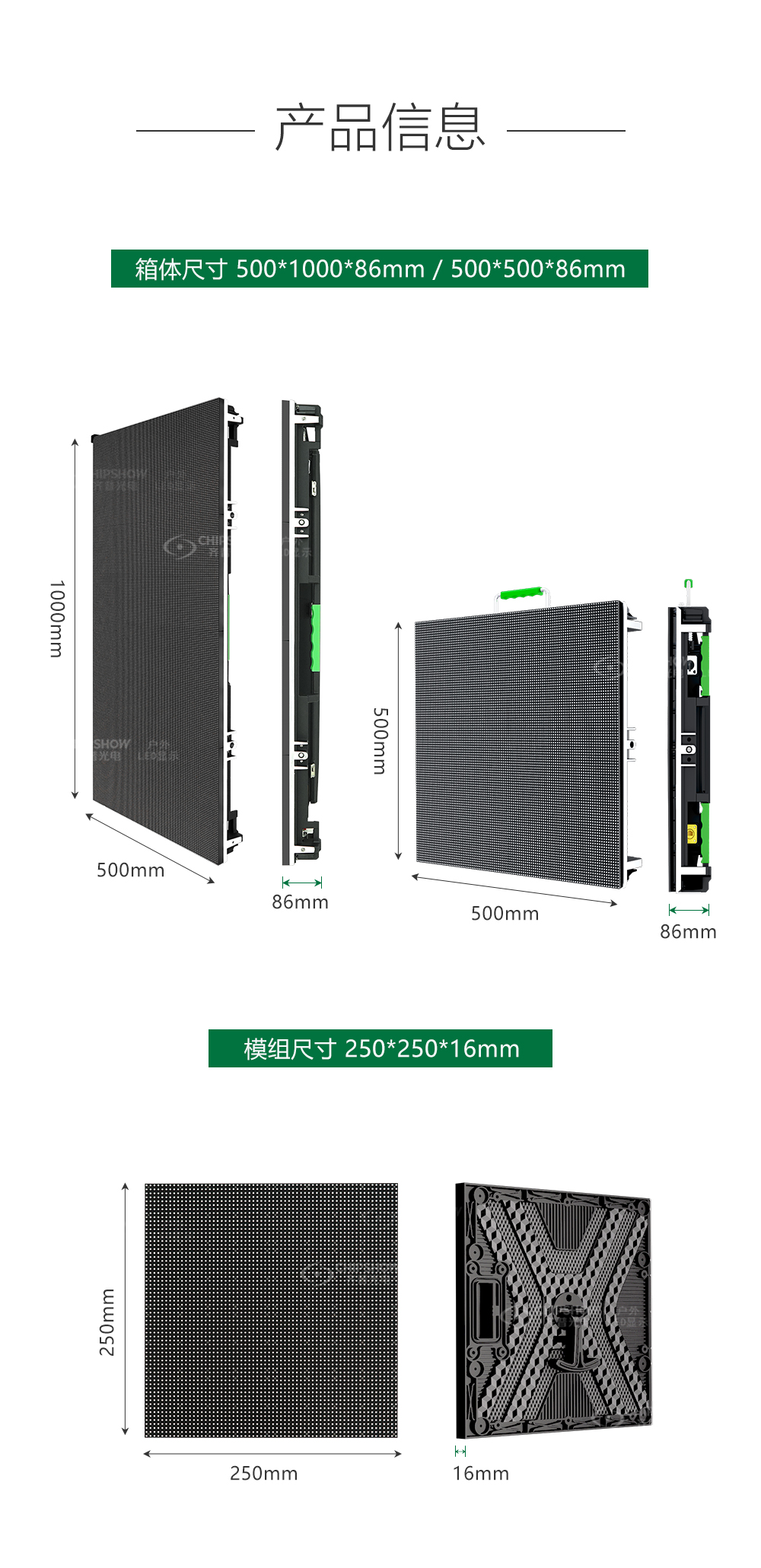 尺寸:模组:250*250*16mm;箱体:500*500*86mm