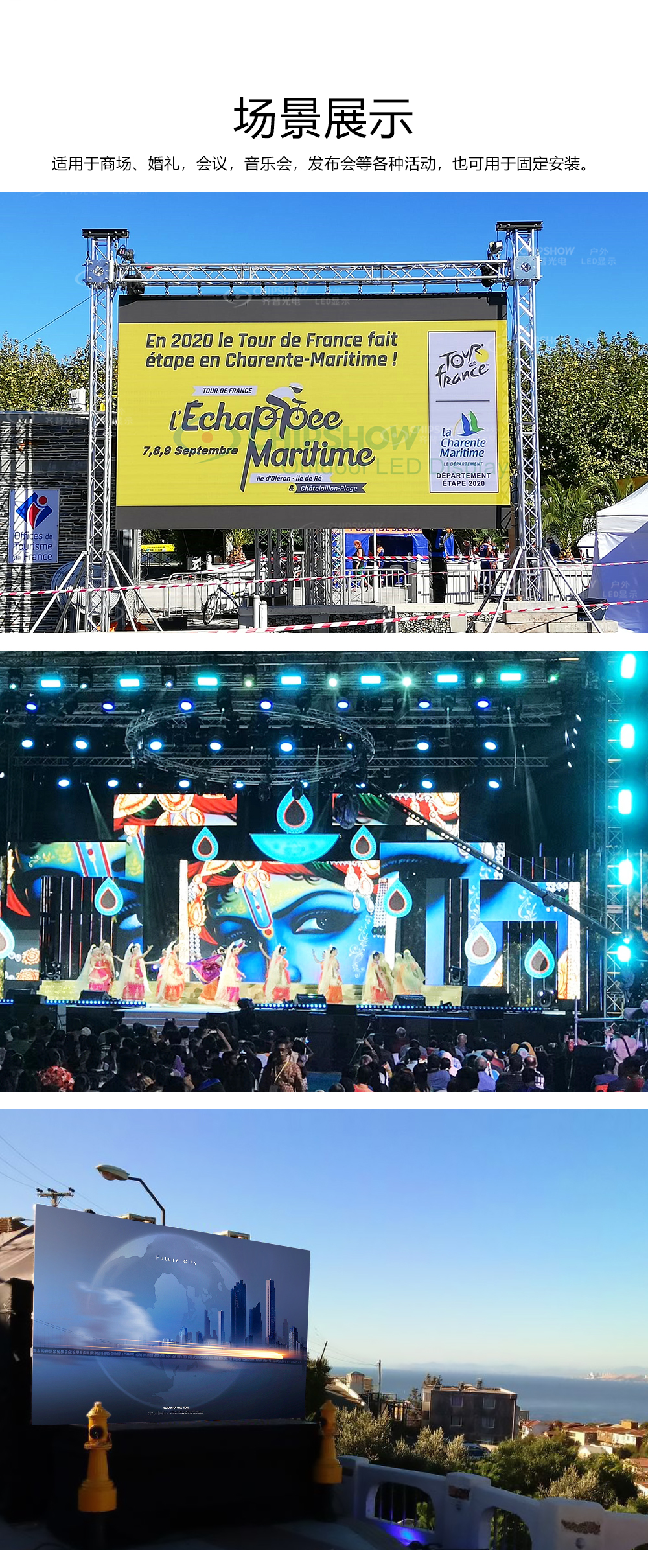 应用场景:演唱会,讲座,舞台,室内商显